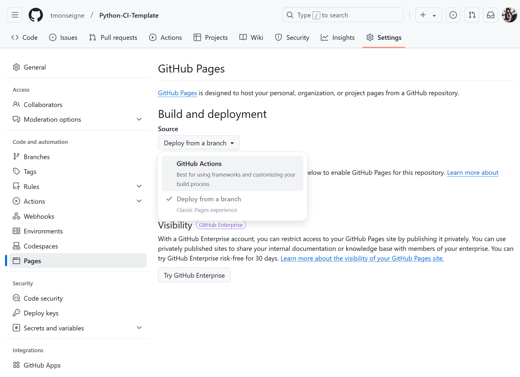 After updating the continuous integration, you will see a change in the Pages settings: .