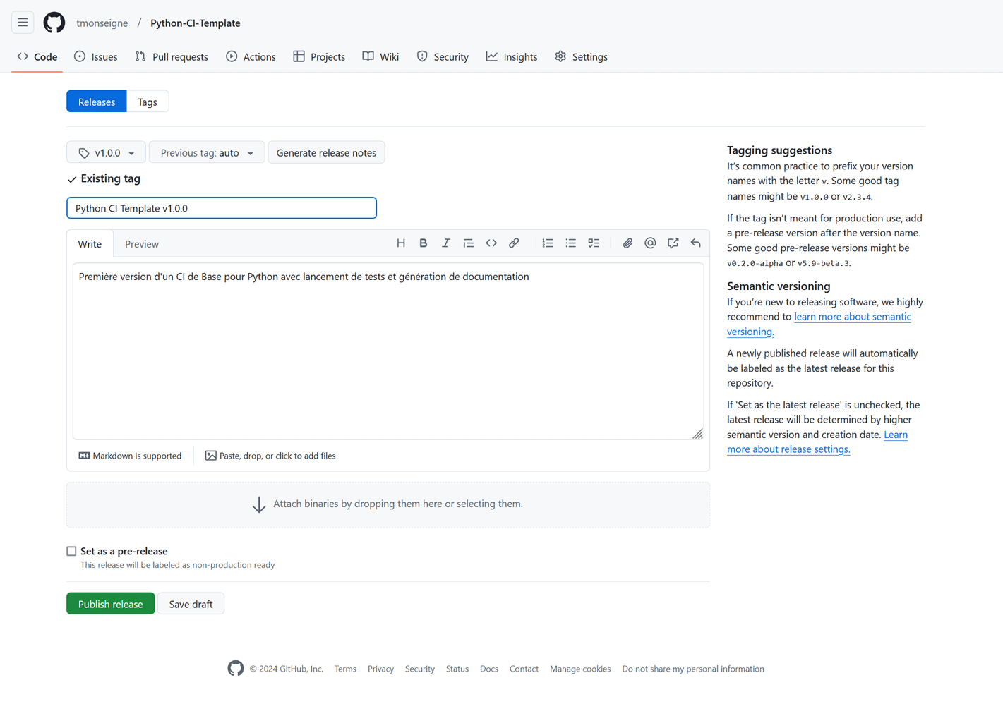 Add a tag (for example, v1.0.0) and a description of the changes.