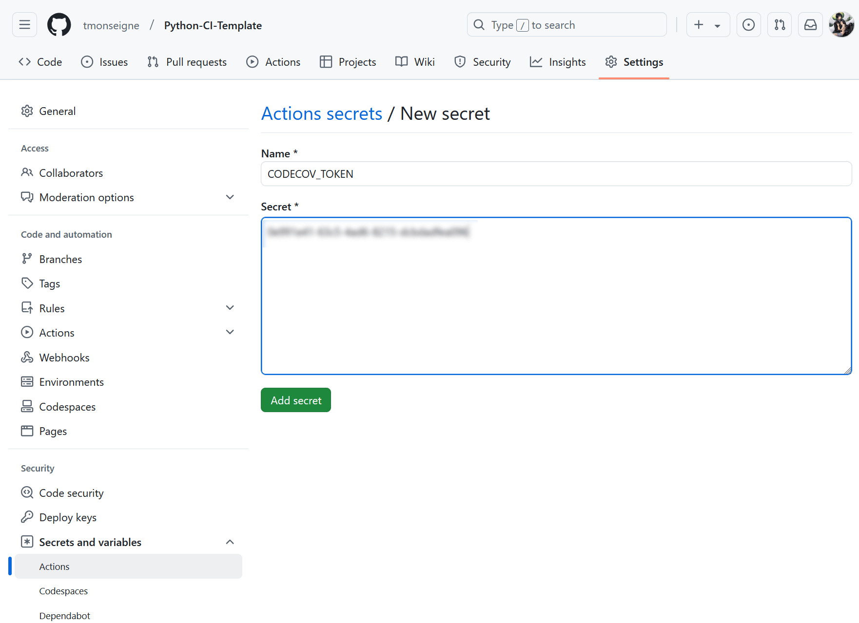 This page gives you instructions on how to send your code coverage reports. You must choose GitHub Action and copy the token shown below.
