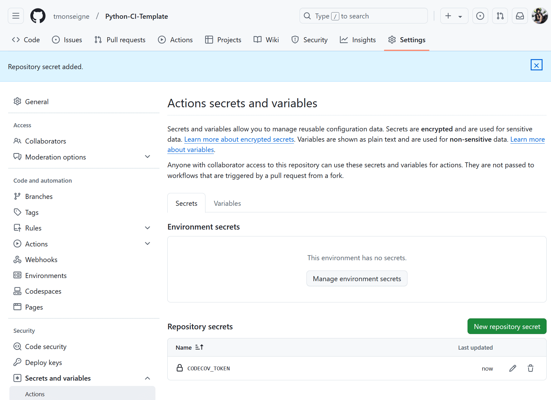 Once validated, you will return to the previous menu and the variable will appear in the list (the token is obviously hidden).