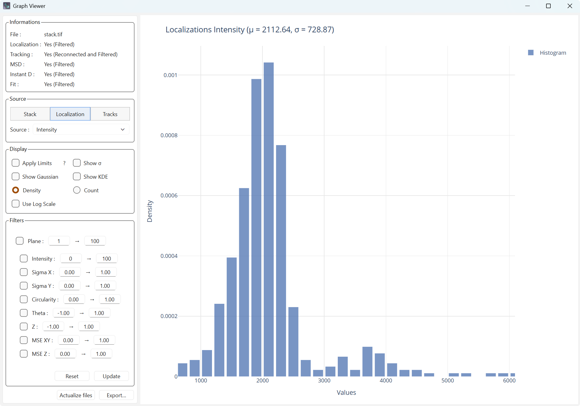 Chaque filtre doit-être coché pour être effectif, mais ne sera pas appliqué tant qu’il n’y aura pas d’appuie sur le bouton Update. À ce moment, les filtres seront appliqués au sein de l’interface principale sur les dernières données en mémoire (données de base ou déjà filtré), les options de filtrage seront mises à jour également dans l’interface principale.
