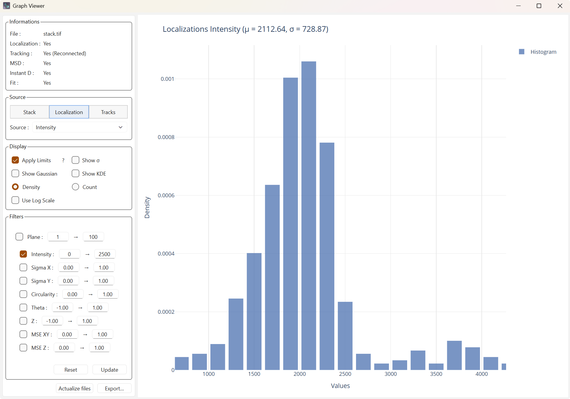 La visionneuse est initialement faite pour être lancée et utilisée à partir de l’interface principale de PALMTracer sur Napari. Il est possible d’ajouter un fichier tif à partir de la visionneuse. Celle-ci sera automatiquement ajoutée au Batch de l’interface principale et les derniers éléments calculés pour ce nouveau fichier seront chargés.